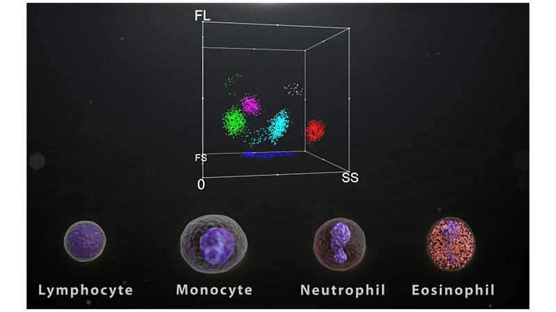 El uso de la citometría de flujo láser combinada con la fluorescencia óptica proporciona una precisión sin precedentes en el recuento de leucocitos, reticulocitos y plaquetas. Mediante fluorescencia, se analiza el material genético (ADN y ARN) para aumentar la especificidad de la categorización celular y evitar interferencias, en particular de los agregados plaquetarios.