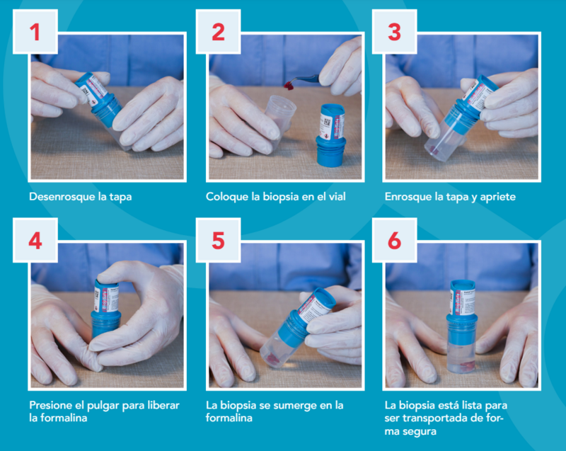 Un envase con un sistema totalmente hermético que lleva incorporada y encapsulada en su tapa la cantidad justa de formol para poder conservar las muestras de las biopsias de forma segura y fácil. Se trata de un producto único de Scil y Seaslab que nos convierte en distribuidores en exclusiva del mismo.